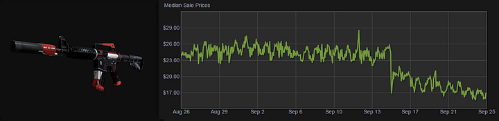 Popular M4A4 skin prices shot up overnight, nearly doubling in price in a hard step function. (ex: Asiimov, $25 → $40)