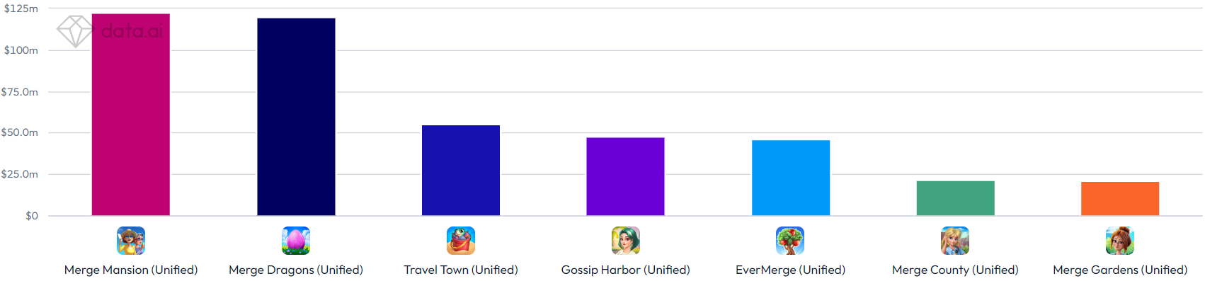 Top Merge games over the last 52 weeks, iOS & Android, Worldwide.