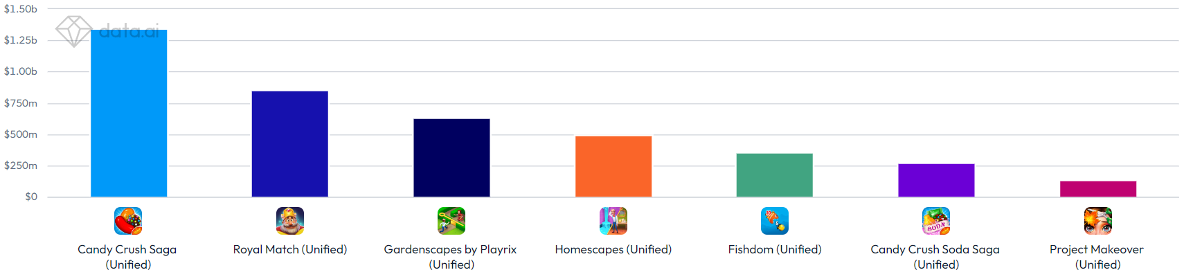 Then there are cases where a breakthrough game successfully navigates a truly opaque red ocean, sailing securely alongside the giants. It's also not because of the lack of quality in the existing games or the genre still being immature. The insatiable demand by that genre’s players and the consistent desire of wanting something new to play gives hope to new entries. Match-3 is the perfect example of this occurrence, which saw quite a few new entrants in the past few years despite being a crowded market with many dominant players. During Candy Crush Saga’s reign, we saw Playrix (Homescapes, Gardenscapes, and Fishdom), AppLovin (Matchington Mansion and Project Makeover), and Dream (Royal Match) produce titles that were able to compete against it. Moreover, considering that Match-3 games have generated a remarkable $5 billion from in-app purchases in the past year, compared to the $600 million from Merge games, even the less successful Match-3 games are in a relatively favorable position.