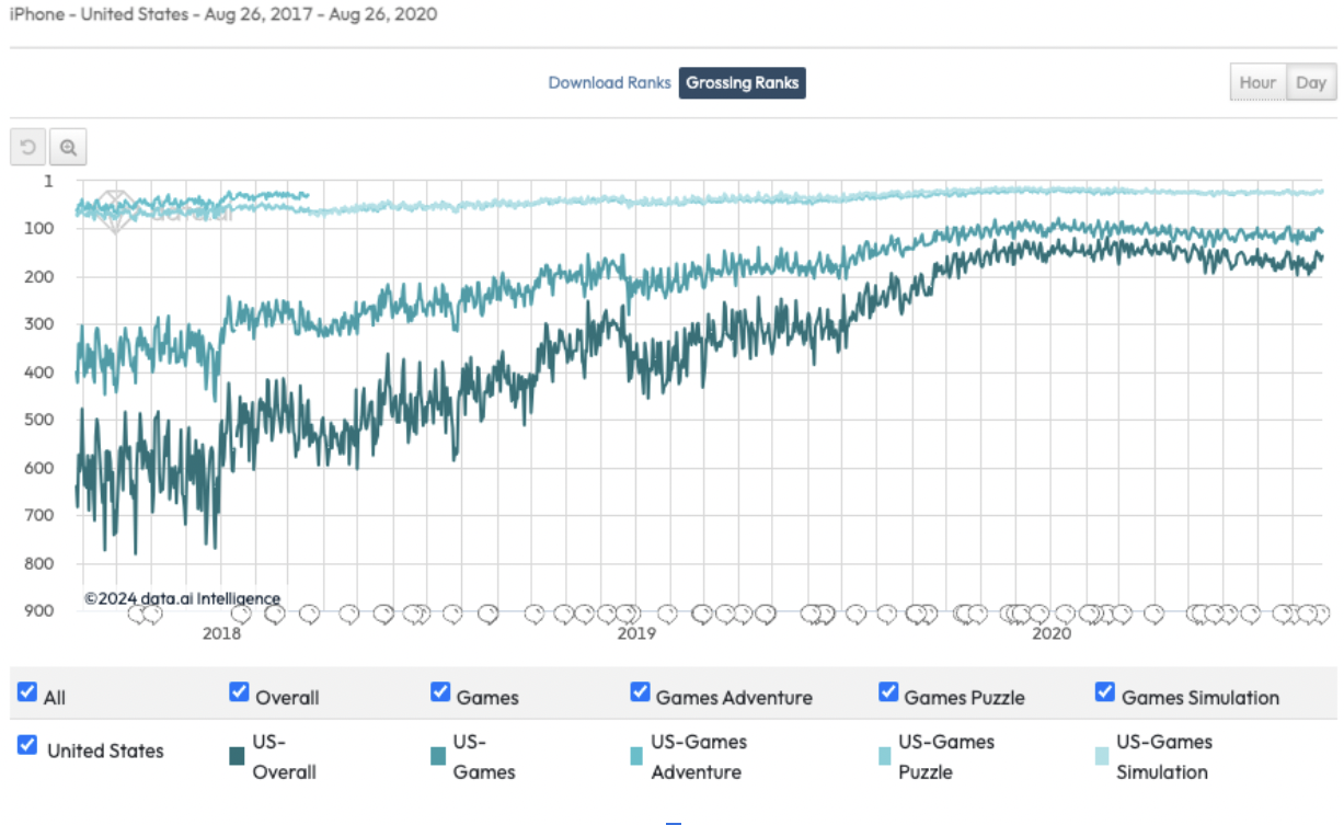 Here in the screenshot, you can see how our position in the Top100 US App Store grossing games has changed from 2017 to 2020, according to data.ai. That was the time when we drastically rebuilt Clockmaker's LiveOps.