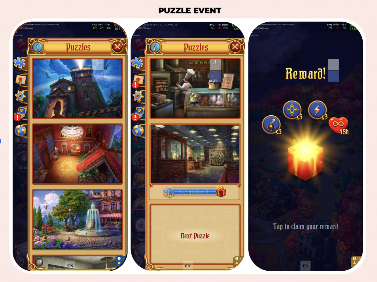 Another example is the 'Puzzles' collection mechanics, where the player farms puzzle pieces in hard match-3 levels to assemble pictures.