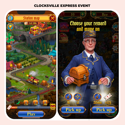 Or the Clocksville Express event. It's quite easy for the player to collect 'tickets' in match-3 levels to move the train along the map. When the train stops at the station, the player is faced with a choice: take small rewards and try to continue earning tickets, or take additional tickets to get the main prize as soon as possible. So this choice brings this event the needed level of complexity.