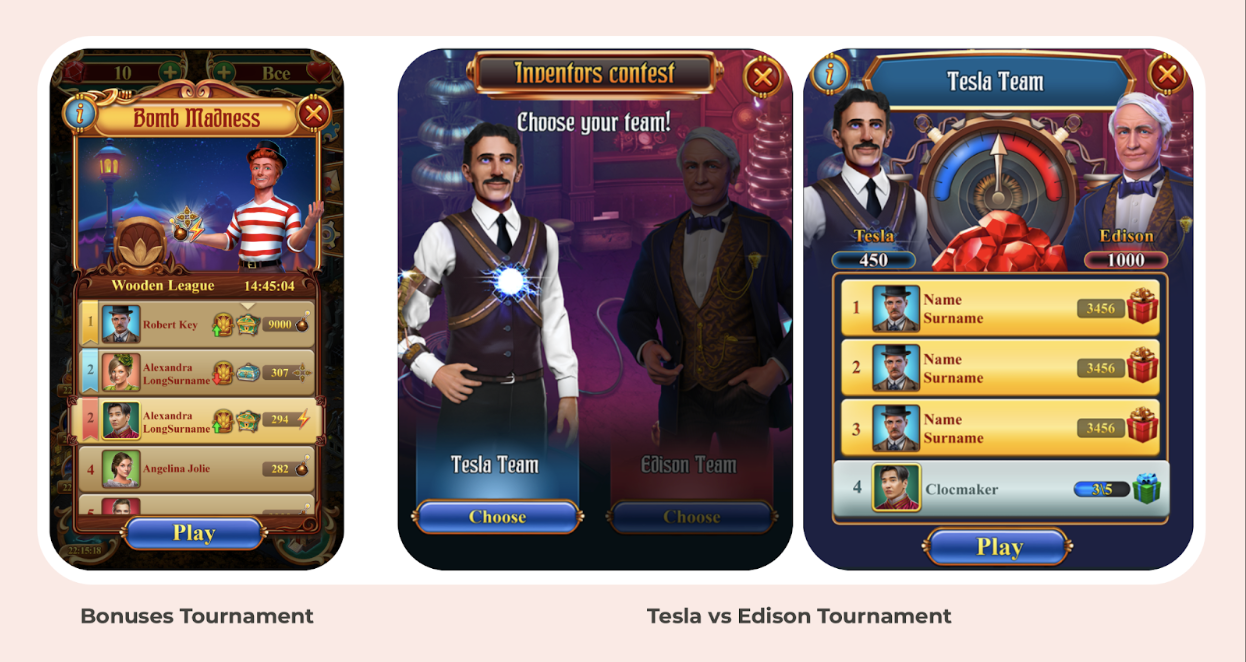 Next, we had a tournament for collecting a single 'lightning' bonus—a historic battle between Tesla and Edison. The rules didn't change much—in fact, they became a bit more complex, with the player required to collect only lightning instead of all types of bonuses. But, through creating a solid logical link between 'game mechanic—meta gameplay—characters,' we managed to craft a much more engaging narrative experience. The real-life characters from the game's timeline encourage the player to collect lightning to power their electrical devices and win the progress race. The more lightning they collect, the stronger the charge, increasing their chances in the competition. After we launched this event, it exceeded our expectations.
