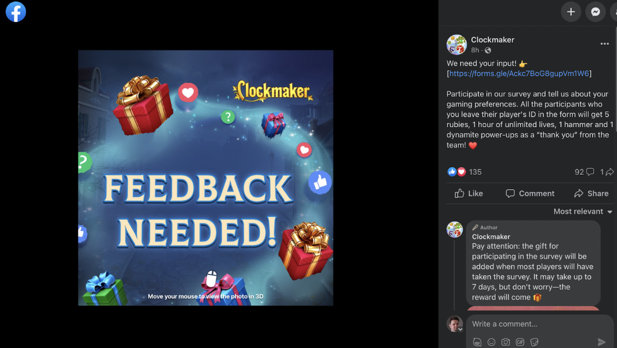 Collect feedback, follow players' community posts, and conduct surveys. Many teams neglect this opportunity. Most commonly, projects with a data-driven approach, which dictates the use of data and analytics as the main tools for decision-making and experimentation. But numbers can't always tell you what players like.