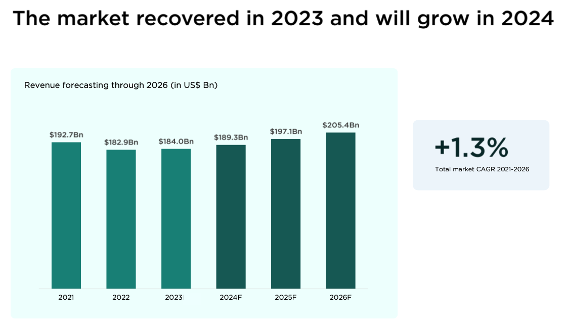 Despite projected growth, the game industry is still lagging behind the lockdown era. If you adjust against inflation, which is projected at 3% in the US, the industry declines at a 2% compound annual rate. Source: Newzoo