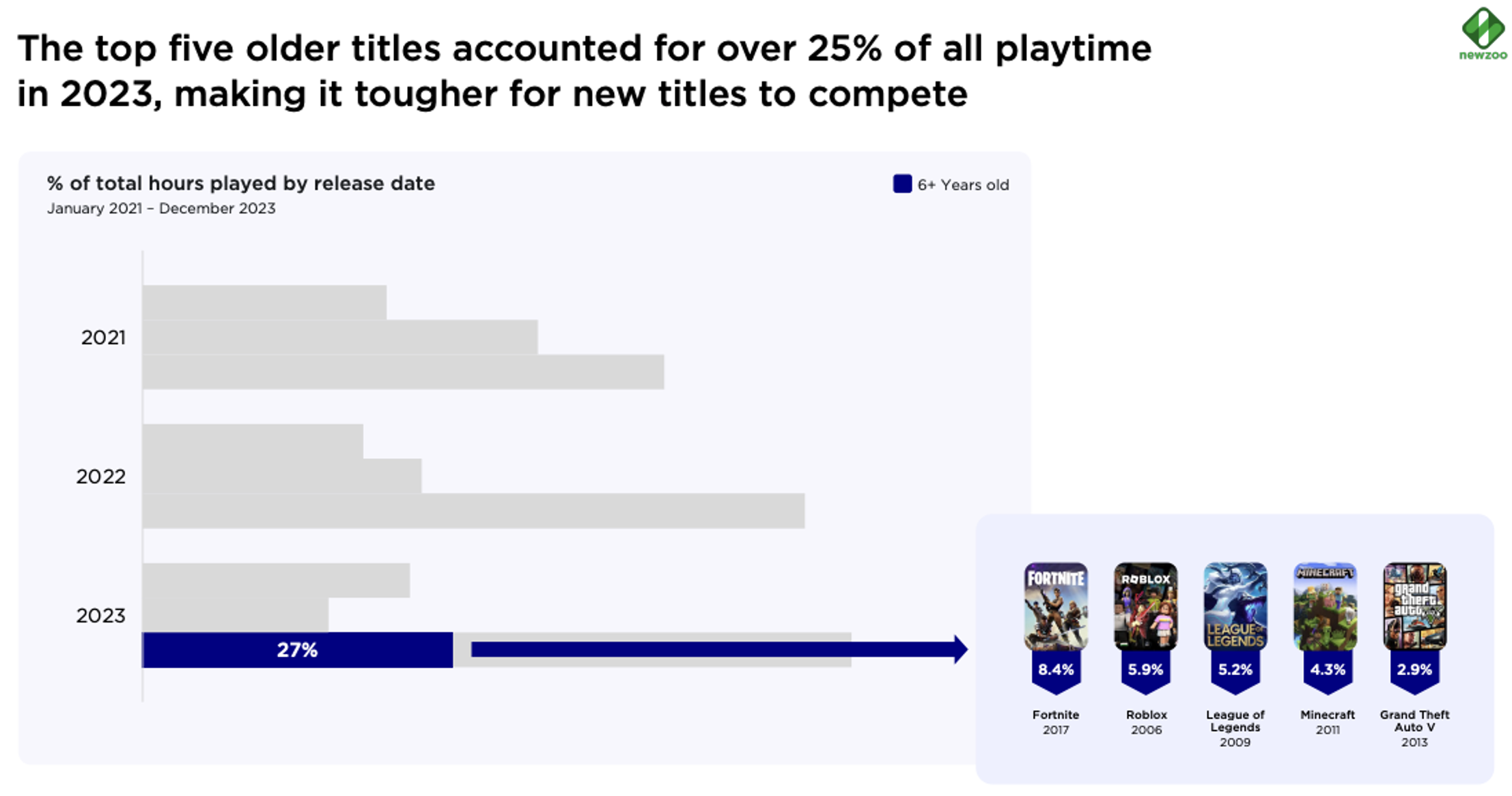 In 2023, the top five titles out of all six-year-old games captured 27% of all playtime. The longevity of these titles and their supremacy over playtime, combined with the finding that playtime hours are shrinking overall, indicates how entrenched these hours are. Simply put, these hours are not part of the addressable market for other games. Source: Newzoo
