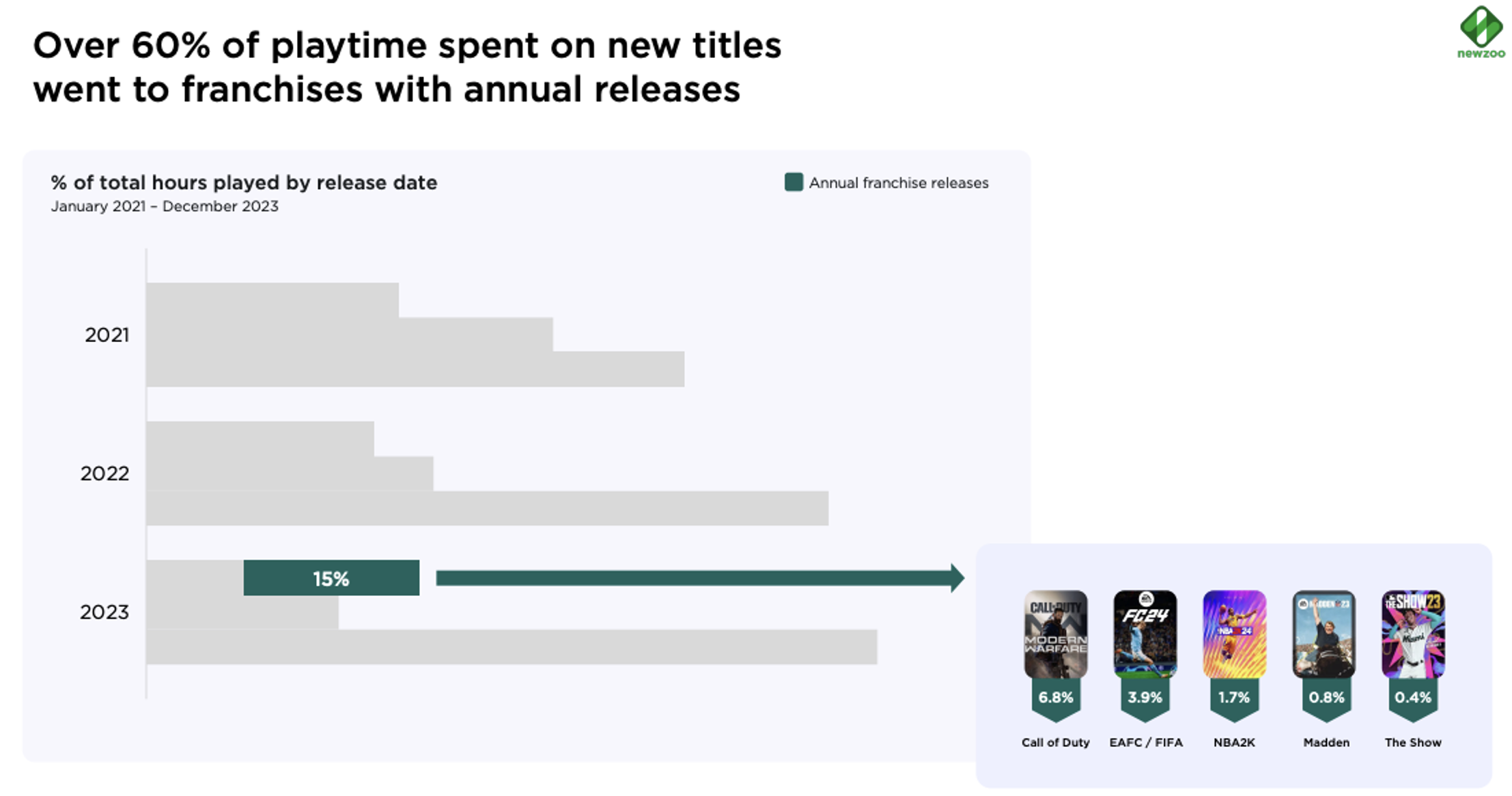 Out of that 23% share of total playtime that went to new games (released fewer than two years ago), yearly franchise titles accounted for 60%. That means that annual releases snagged around 15% of total playtime. Studios hoping to release a new title will find it challenging to include these playtime hours in their addressable market, as they nearly always go to these games that engage players on a reliable annual basis. Source: Newzoo