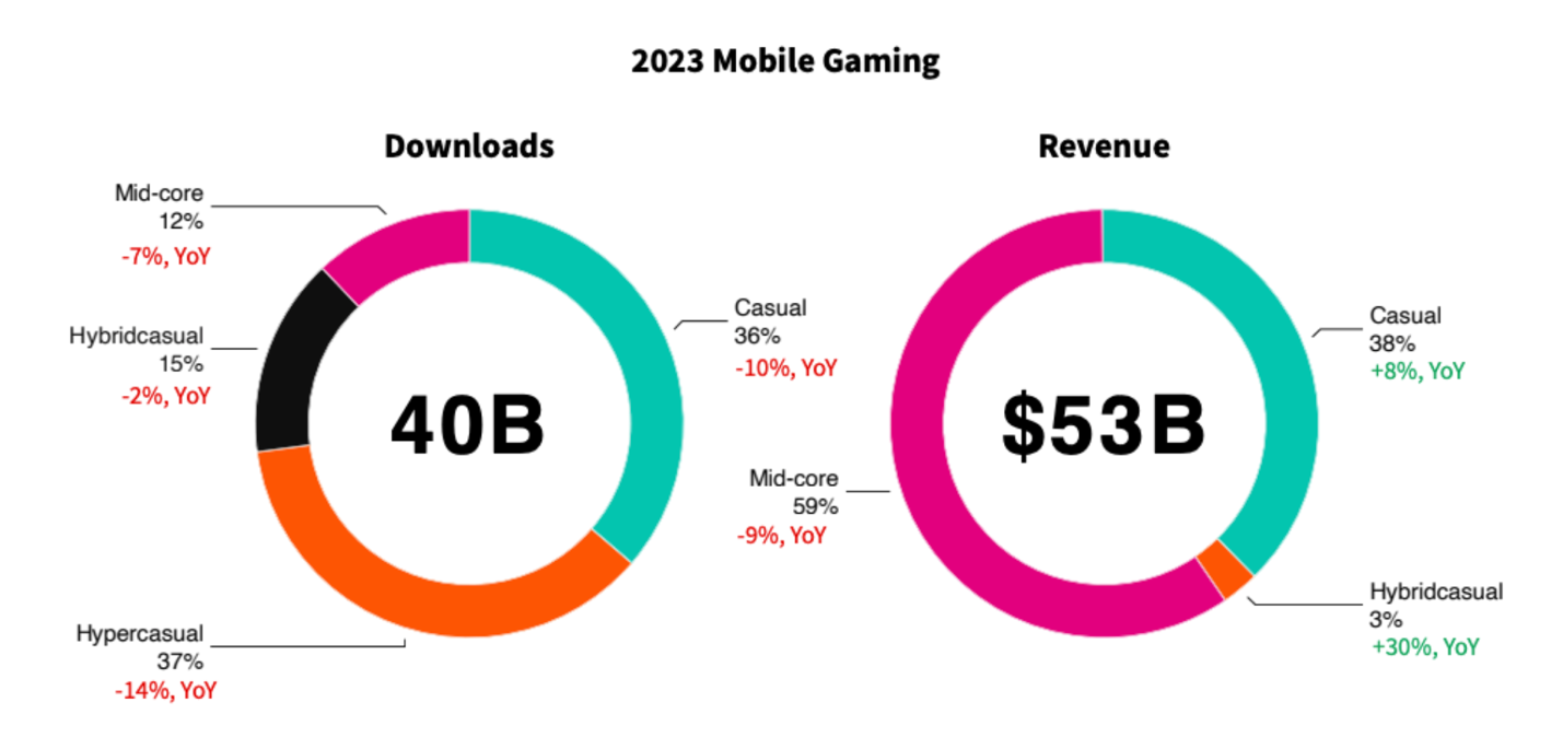2023 was a challenging year for the mobile gaming market. A year-over-year comparison shows a downturn in total worldwide downloads across both major stores.