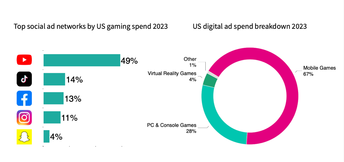 Mobile games command a dominant 67% share of global gaming ad spend, with PC and console games trailing at 28%. Across top social media platforms, YouTube leads in the US, earning 49% of total gaming spend.