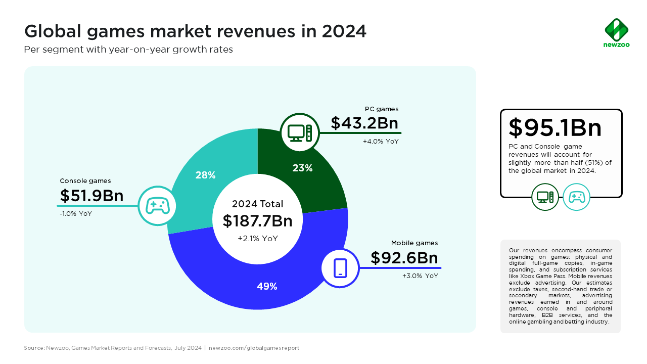 Recently, I had the privilege of discussing the latest market insights with Devan Brennan, Senior Consultant at Newzoo, dissecting their August 2024 market forecasts. This conversation painted a nuanced picture of the current market, particularly the PC/console segment, and offered a glimpse into its future trajectory.
