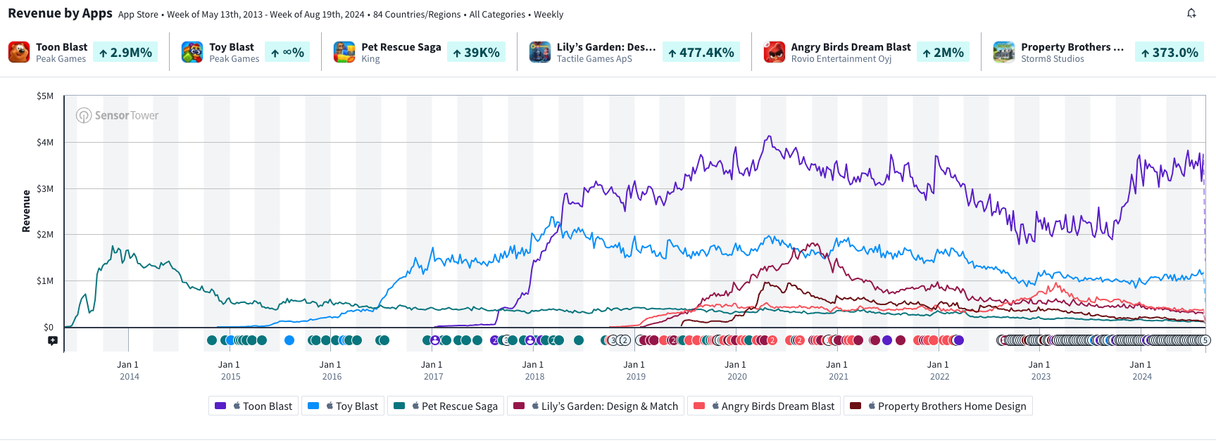 That said, the second spot in the puzzle market remained largely uncontested until recently. Before Merge games took over the second spot, Blast games were the Pepsi to Match-3's Coca-Cola. There was a significant gap between Match-3 and Blast, with Blast holding a solid second place for a long time. And this space was largely dominated by two major titles: Toy Blast and Toon Blast from Peak. While other Blast games like Lily’s Garden or Angry Birds Dream Blast are worth mentioning, they never reached the household name status that Peak’s titles have.
