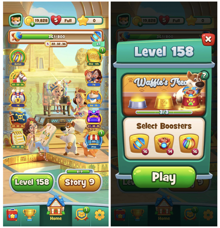 We've already covered some unique aspects of the game, with more to be discussed later in the article. However, the metagame isn't among those unique aspects, as it closely resembles what Royal Match offers—which we can call a "Light Meta.". Players need to complete levels to earn stars, which they then use to complete tasks. Finishing these tasks progresses them through various scenes in the game. The unique aspect of Time Blast's metagame is that its scenes aren't static images with random props. The game's narrative follows a family traveling through time, with tasks placing them in various scenes. Their reactions and interactions provide glimpses into their characters. It's not groundbreaking, but it adds a pleasant layer to the Light Meta that many puzzle games use today.