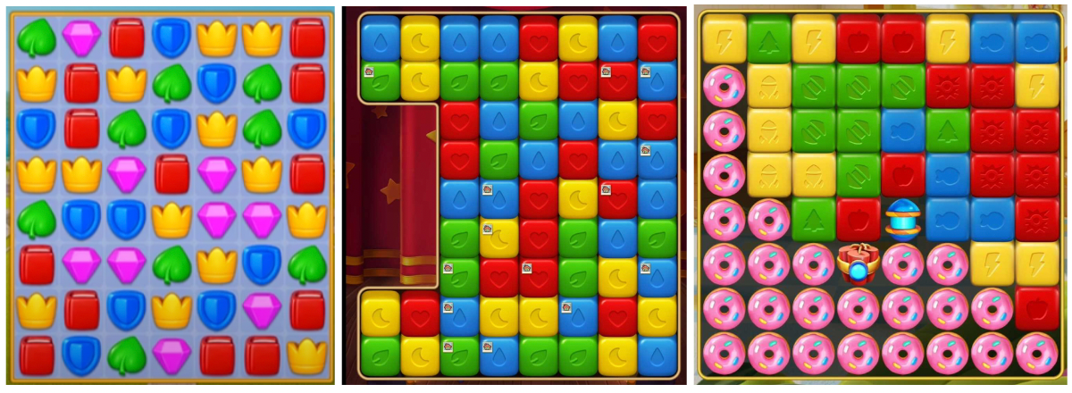How levels look like in Royal Match (left), Toon Blast (middle), and Time Blast (right).
