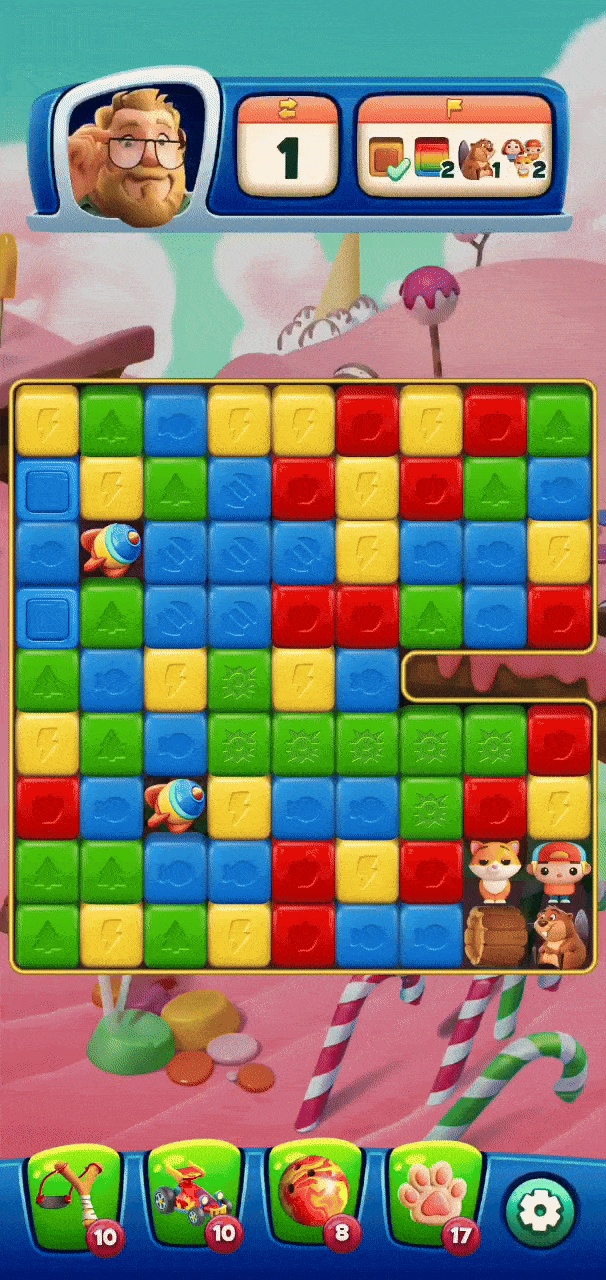 Another notable feature borrowed from the Match-3 space is how power-up combos are handled. In a traditional Blast game, when power-ups touch each other, they form one big combo, with the most powerful one activating when the combo is triggered. For instance, in Toon Blast, if a Rocket is placed between a Disco Ball and a Bomb, the combo will activate the Disco Ball & Bomb effect, with the Rocket simply acting as a link and being overridden by the stronger power-ups. In contrast, Match-3 games don't stack power-up combos. Instead, they trigger only the combination that the player chooses. So, in the example above, the player could activate either the Disco Ball & Rocket or Bomb & Rocket combo based on their selection.