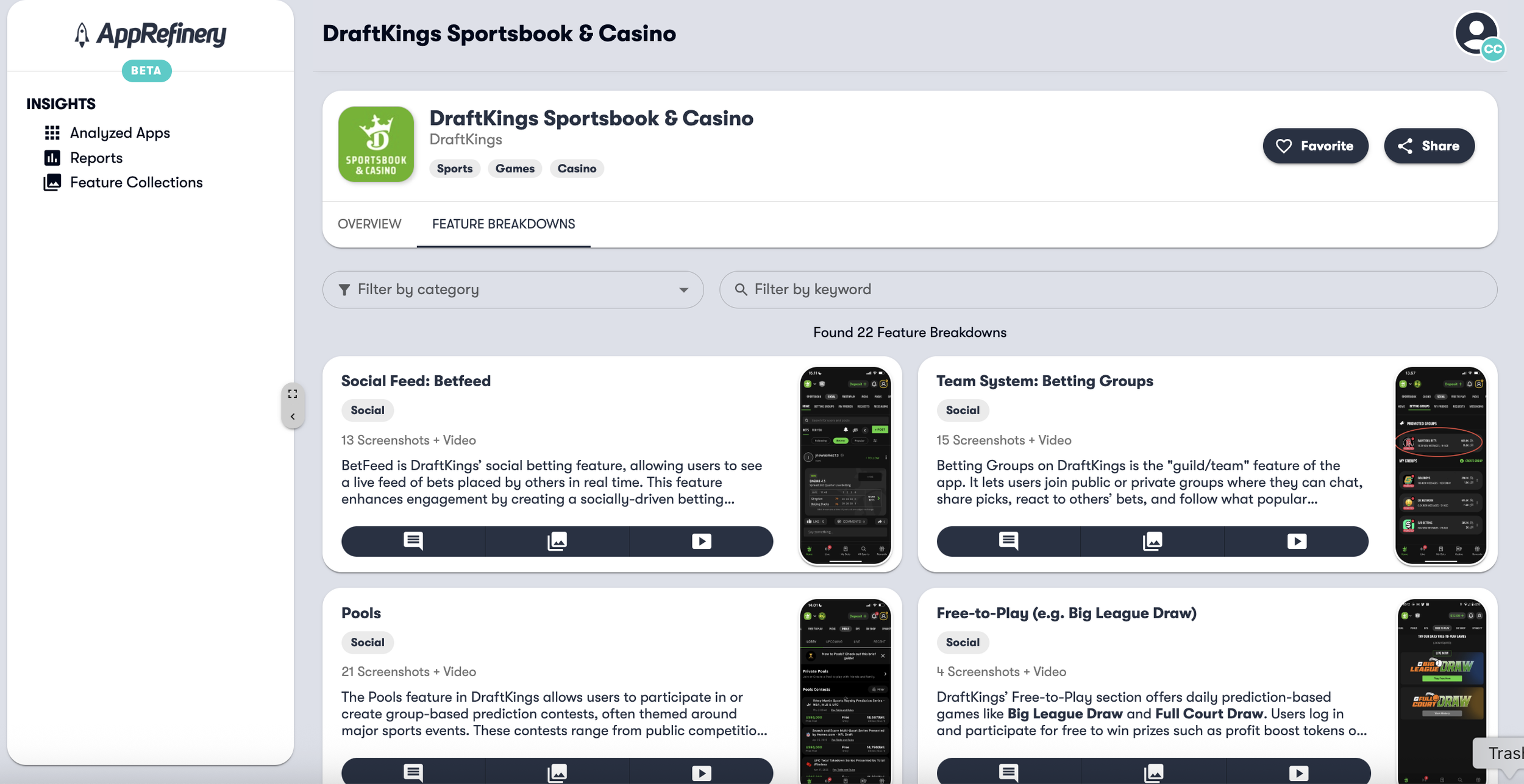 DraftKings’ core social features as seen by AppRefinery: Bet Feed for real-time wager streams, Betting Groups that build communities around shared picks, and Pools – social contests that turn predictions into leaderboard races.