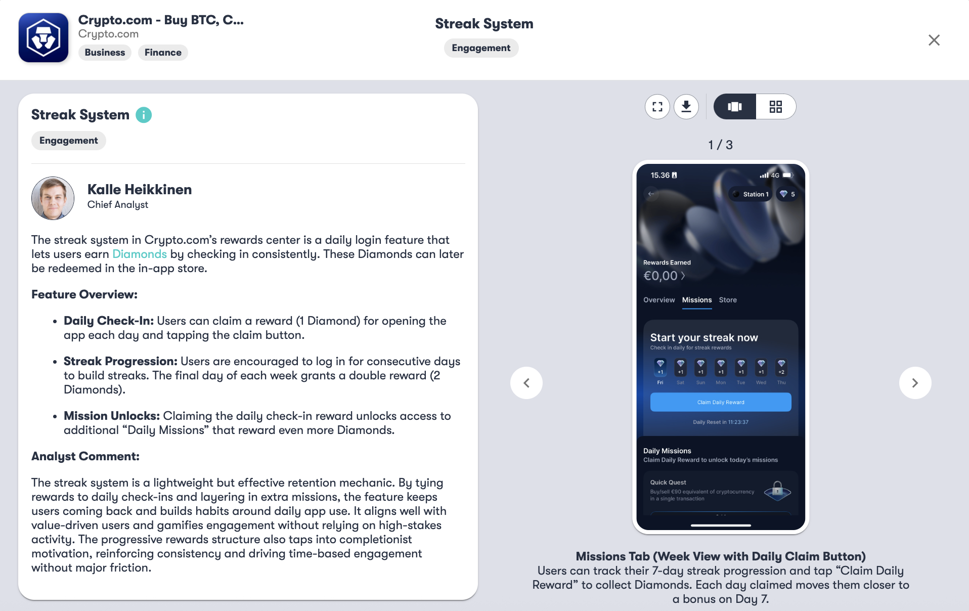 Crypto.com’s engagement features, as analyzed by AppRefinery: Daily Missions and Onboarding Tasks rewarded with diamonds, Streak Bonuses that flatten user activity curves, Achievement Tiers for intrinsic motivation, and the Diamond Store with randomized rewards.