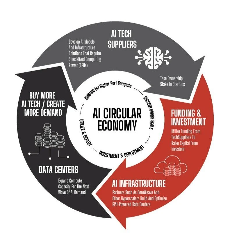 Circular financing is the engine of every bubble: infrastructure providers fund their own customers, who use that capital to buy more infrastructure, creating the illusion of organic demand. Sales growth attracts more investment, which funds more customers, which generates more sales—a self-reinforcing loop that looks like a thriving market until someone asks where the actual end users are.