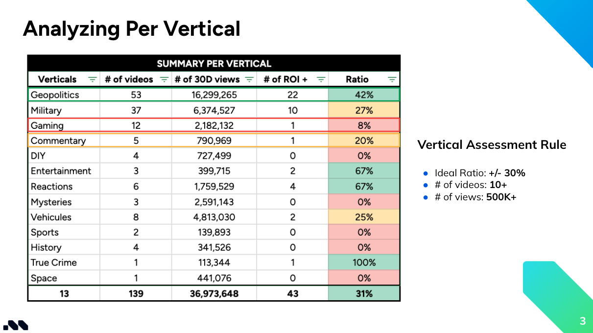 When it comes to performance analysis, you need to look at this at a vertical level, not purely a creator level. One key thing to note is that only about 30% of influencers you work with will be profitable. So looking at the percentage of videos reaching profitability per vertical, anything above 30% can be classed as a high-performing vertical, particularly if you’ve had at least 10 live videos and generated over 500K+ views. Anything below these may not be enough data to make reliable conclusions, so you may want to test these verticals a little further.
