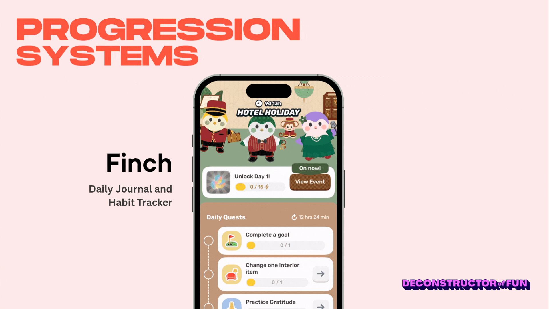 Finch uses Progression Systems (and Battle Pass mechanics) to encourage users to achieve their self-care goals. Their progression is a content-based system.
