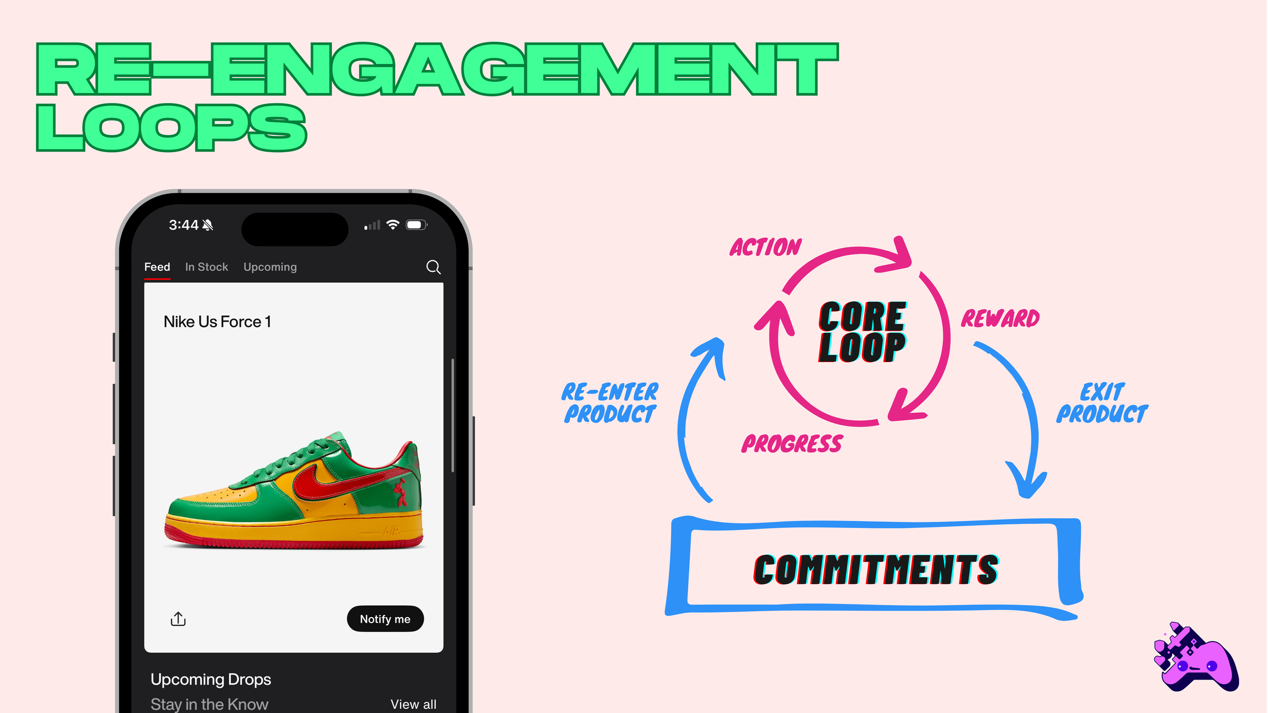The most basic form of a gaming re-engagement loop is a “Streak”, which has been copied by many different types of consumer apps. A more sophisticated type of re-engagement loop is what Nike’s SNKRS app did with “Drops”, which is a combination of new content (Shoes), social currency (have something rare that others don’t), game (participate in the drop) and social conversation. The alchemy of all these elements makes it very satisfying to come back, week after week, to SNKRS to see what’s going on with the culture.