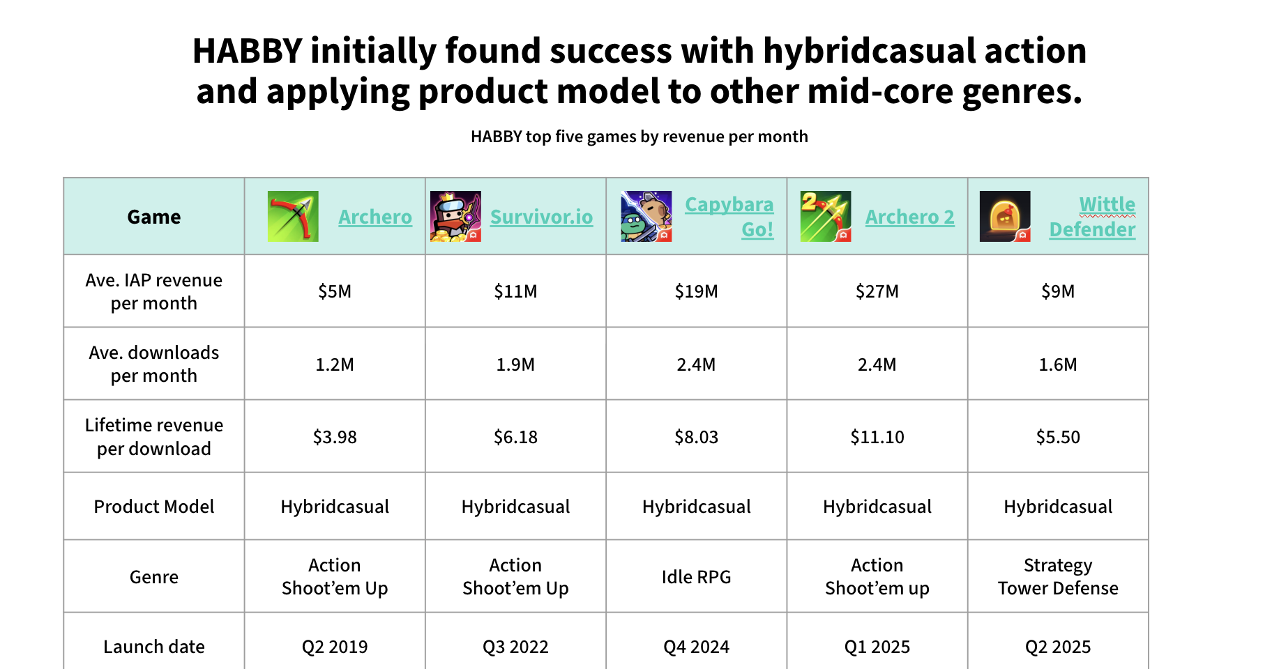 Archero made 30% of its lifetime revenue in its first 10 months. Survivor.io made half. Habby launches hard and makes it count.
