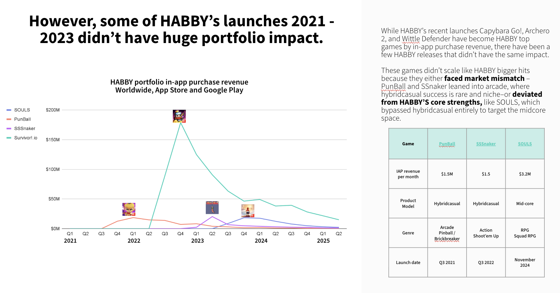 Not all of HABBY’s launches have worked. PunBall and SSSnaker struggled to move the needle, never cracking more than $1.5M/month in revenue, far below their predecessors.
