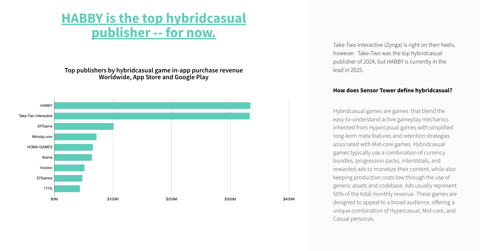 Today, HABBY sits atop the hybridcasual mountain. They are the leading publisher globally in this genre, edging out even Take-Two Interactive (Rollic), which took the top spot in 2024. But the gap is slim, and the chase is real.