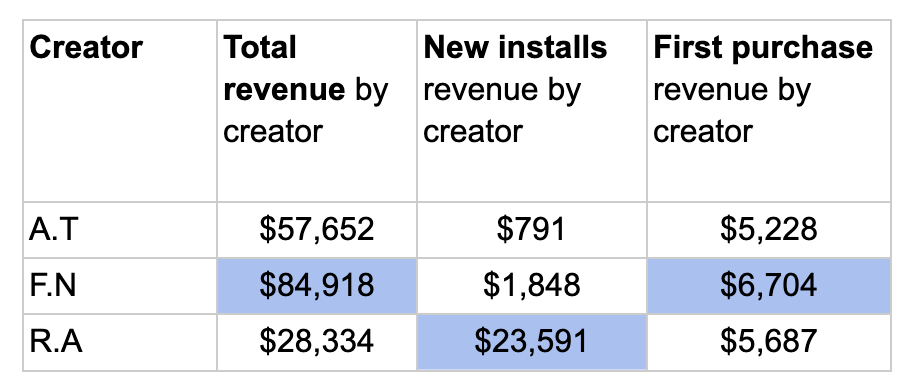 We found that the revenue generated from creator A.T. was mostly coming from returning users, not new ones. However, a smaller revenue-making creator, R.A, was bringing a much higher % of new users out of her revenue generated, and had a higher % of players converting to FTDs out of her revenue.