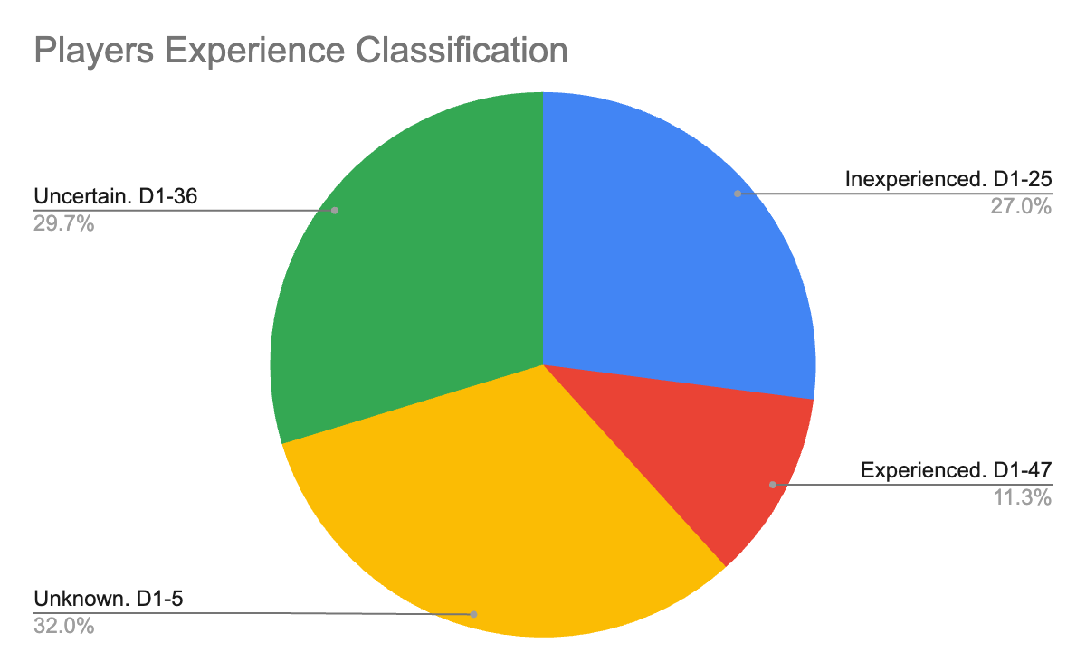 Players who churned before we could classify them also accounted for about ⅓, with a very low D1 of 5%.