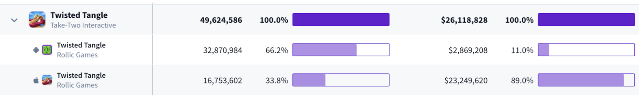 All-time downloads & revenue of Twisted Tangle (likely pulled ~15M from ads alone, with Android carrying a disproportionately large share of IAA)