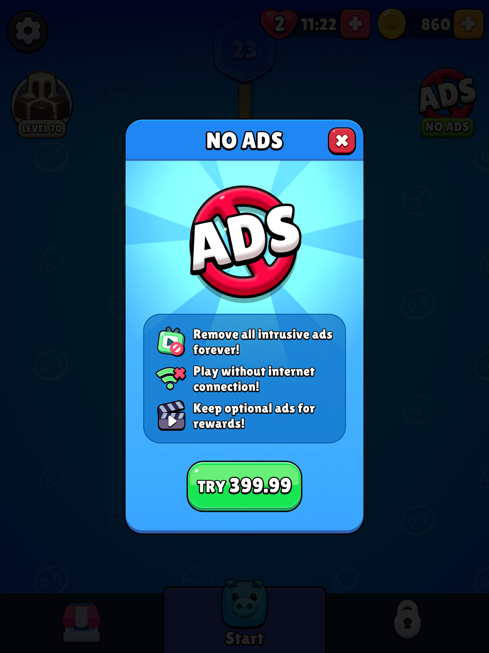 Monetization in Pixel Flow is intentionally boring and that’s a good thing. Ads are also deliberately aggressive once players are invested (roughly after level 20). There’s no easy “airplane mode” escape hatch, unlike in some competitors. That pressure is intentional: the intrusiveness of interstitials, combined with strong core engagement, makes the Remove Ads IAP convert extremely well. In this setup, ads don’t just monetize - they actively reinforce IAP demand.