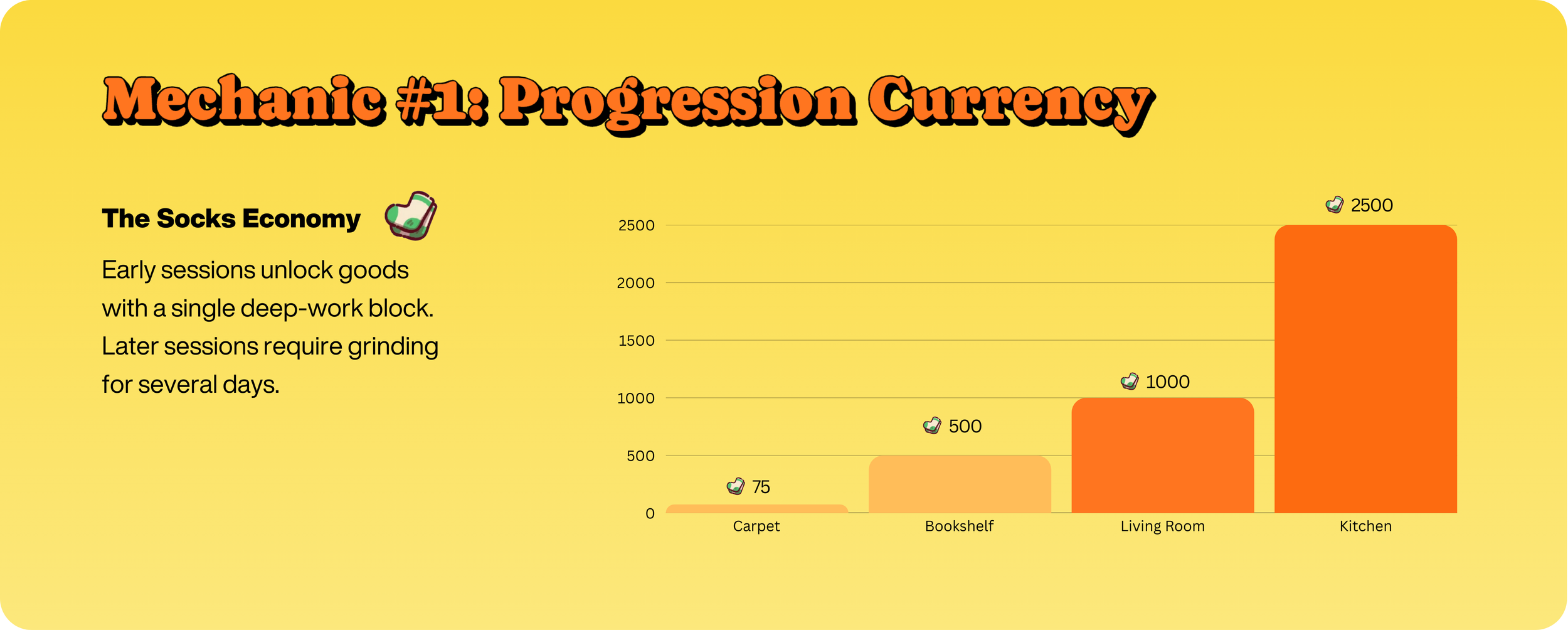 Socks is the primary currency to unlock progression in the app: you must spend currency to build a beautiful home. Focus Friend could have easily gifted users digital items directly, rather than currency. The choice enables two key unlocks: (i) provide user choice in how to decorate / build; (ii) scale up / down rewards depending on the length of your deep-work session. Currency also gives developers a key tool: economy balancing levers. Early purchases take a few hundred socks, while mid/late-game building takes thousands of socks. Easier progress early; more challenging progress later.
