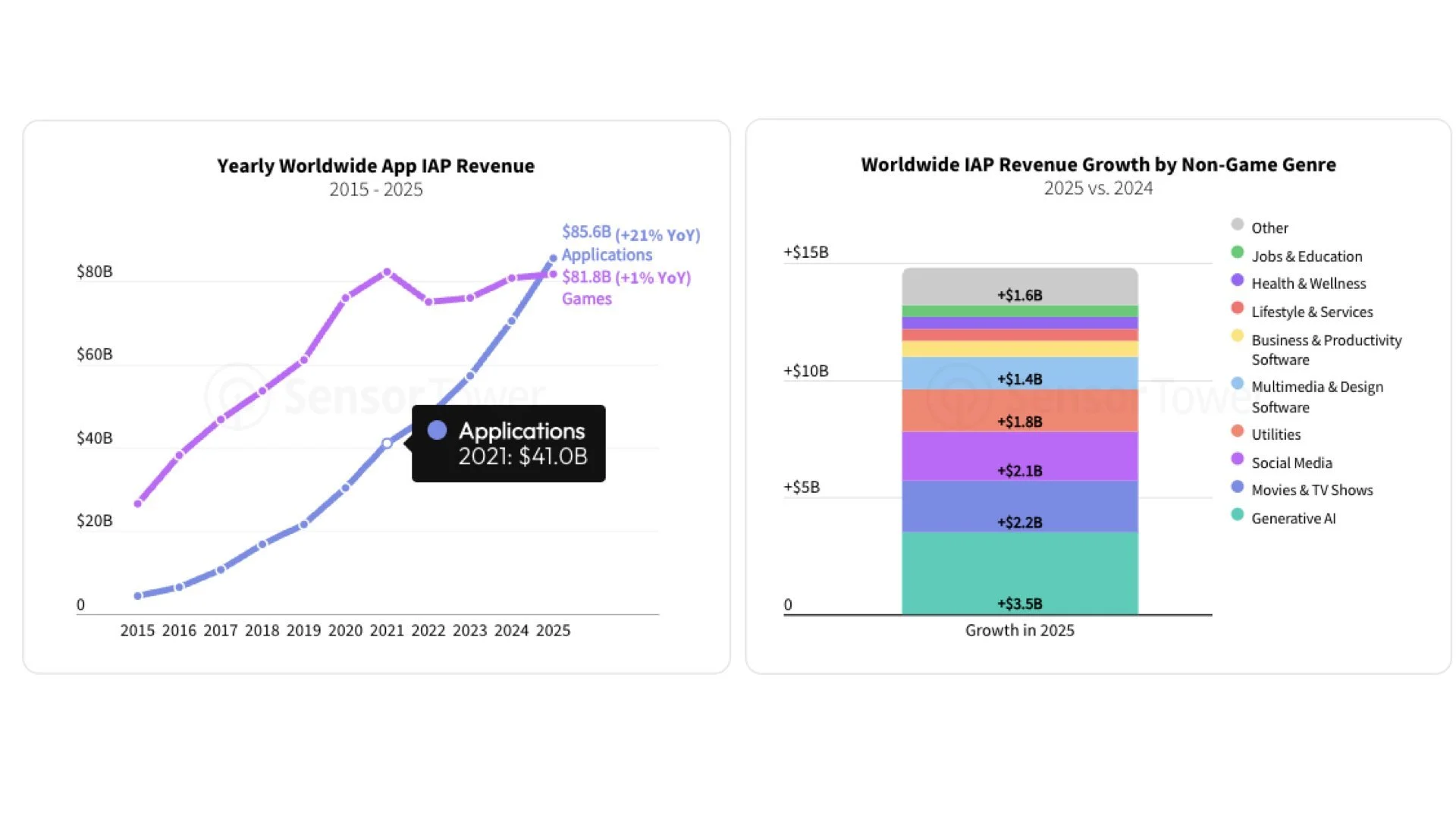 Non-game apps have surpassed games in IAP in 2025 revenue, and the separation is only growing. Apps hit $85.6 billion versus games $81.8 billion in 2025.