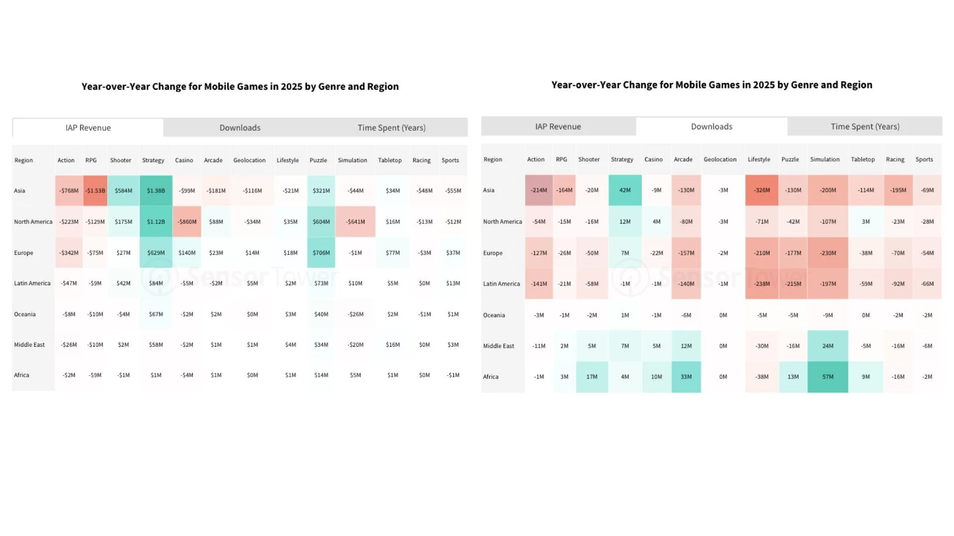 Year-over-Year Change for Mobile Games in 2025 by Genre and Region