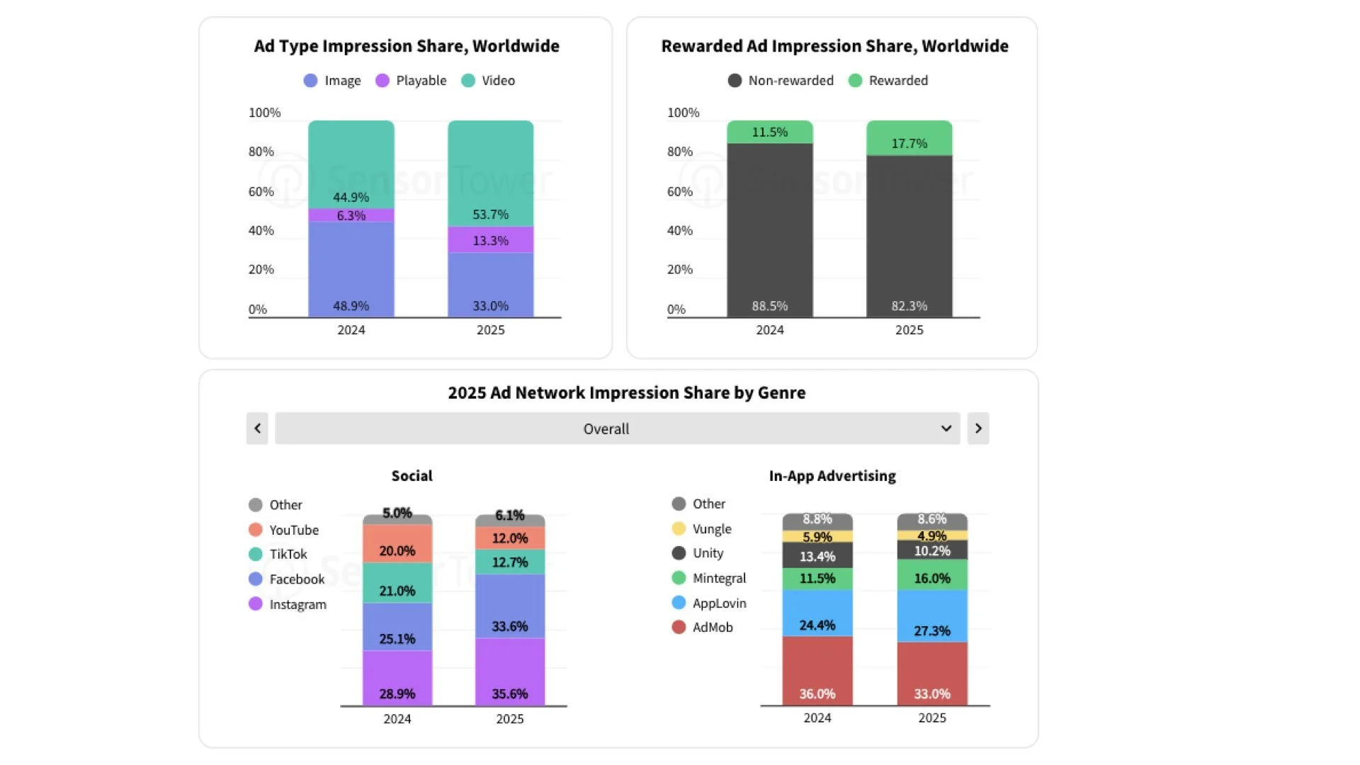 The ad ecosystem is consolidating. Video continues to dominate, but playable ads gained a meaningful share, and rewarded video is up. This shift changes creative strategy significantly, particularly the split between midcore and casual games.
