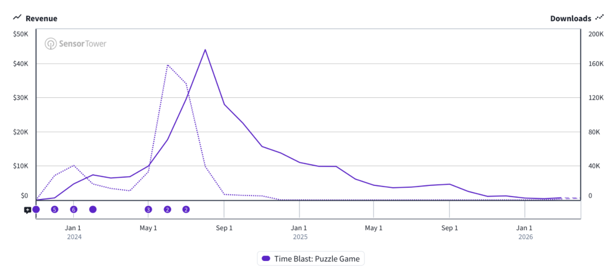 Time Blast launched in 2024. It was one of the most visually refined Blast games ever made. It also failed because the Blast market had been closed for three years before it arrived. While the puzzle market grew through legacy subgenres like Match-3 and Merge and evolved with newer ones like Match 3D and Sort, Blast failed to keep pace. The most recent Blast game to cross $40M in lifetime revenue was Penny & Flo, which launched in 2020. The market took a nosedive from the beginning of 2021 and never fully recovered since.