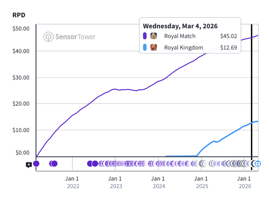 Talking about Candy Crush. It’s not just a game. It’s a cultural reference. Royal Match is becoming one. Royal Kingdom is still in the phase where spending drives the number. When the spending slows down, what the game earns on its own will matter a lot more than it does today.